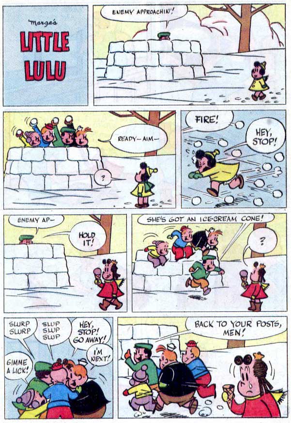 E ainda tínhamos as histórias em que Luluzinha para entreter ao capeta de Alvinho lhe contava histórias da “triste menininha”, uma versão dela mesma que enfrentava a rudeza do mundo e muitas vezes as maldades da bruxa Alcéia e de sua sobrinha Meméia. Ao parecer, Stanley conseguiu elaborar uma série de situações ‘típicas’ e à maneira de Herriman brincar com elas de tal maneira que no final eram histórias diferentes. Este recurso, típico de roteiristas talentosos, também era utilizado por Carl Barks, Shulz e Dirks entre outros. Para o ano de 1951, o domínio da cena que John Stanley tinha era tão bom que as histórias pareciam surgir sem dificuldade aparente. Foram exatamente estos anos o auge da criatividade de Stanley chegando a escrever os roteiros de 12 revistas mensais da Little Lulu (o número de páginas ia de 36 a 52 páginas). Além disso se encarregava de escrever e desenhar as histórias para a revista trimestral de Tubby que só em 1955 passaria a ser desenhada por Lloyd White. E, por se fosse pouco, entre 1955 e 1958, ele ainda produziu as histórias para dois especiais por ano de Luluzinha e sua turma com 100 páginas cada um. Tal esforço criativo tinha um preço e, no caso de Stanley, que sofria de depressão numa época em que não existia o Prozac, a solução foi encontrada no álcool. Além disso, ele tinha que lidar com a frustração de não poder assinar seu trabalho. Isto para alguém que trabalhava praticamente sozinho (os contatos com Tripp foram contados) deve ter contaminado sua maneira de ver os comics.