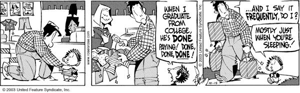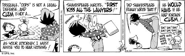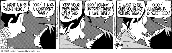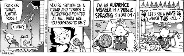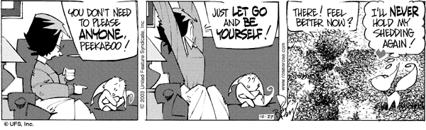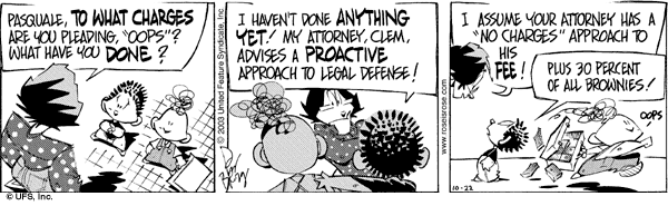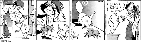 Rose is Rose Mário Latino Numa época em que tiras em quadrinhos parecem se resumir a cabeças falantes, “Rose is Rose” parece ser uma boa exceção. Escrita e desenhada por Pat Brady nos narra o dia a dia de Rose , a protagonista, seu esposo Jimbo e o pimpolho Pasquale . Dito desta forma até poderíamos pensar que é uma “family strip” convencional. Nada mas falso, pois Brady nos obsequia com uma abordagem ousada, com perspectivas e ângulos pouco comuns, que resulta num visual arrojado, bem diferente da mesmice das “comic strips” de hoje. E se o desenho é bom, muito bom mesmo, é bom apontar que ele só serve aos propósitos de um texto primoroso como poucos. Porque as experimentações do autor não se restringem ao aspecto visual, pois ele muda a aparência das personagens conforme os sentimentos das mesmas. Assim, quando Rose visita a sua mãe e esta lhe oferece biscoitos caseiros recém saídos do forno, a protagonista se transforma numa garotinha feliz. Algumas